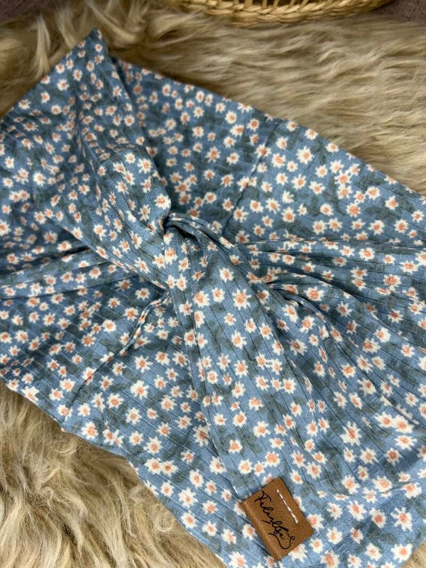 Breites Haarband hellblau mit kleinen Blümchen aus Viskosejersey